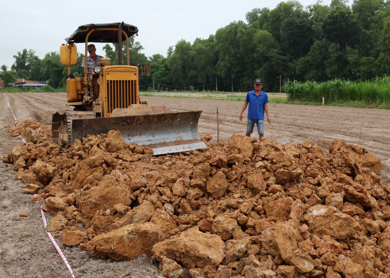 Thi công đường liên tổ 18, 19 ấp Trâm Vàng 3, xã Thanh Phước, huyện Gò Dầu. Ðể thực hiện con đường này, hai người dân địa phương là ông Phan Ðức Trọng và ông Phan Hoài Phương đã tự nguyện chặt cây trồng lâu năm trên phần đất nhà, trị giá khoảng 150 triệu đồng. Ảnh: Công Kha