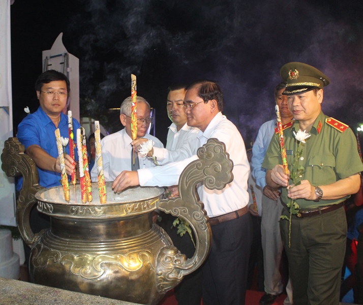 Ông Nguyễn Minh Tân- Phó Bí thư Thường trực Tỉnh uỷ đã đánh 3 tiếng chuông chiêu hồn những anh linh liệt sĩ. Các vị lãnh đạo Trung ương, tỉnh đã thành kính mặc niệm, dâng hoa, thắp hương tưởng nhớ hương hồn những anh hùng liệt sĩ đã ngã xuống vì độc lập dân tộc, thống nhất đất nước, vì sự toàn vẹn lãnh thổ và đoàn kết quốc tế.