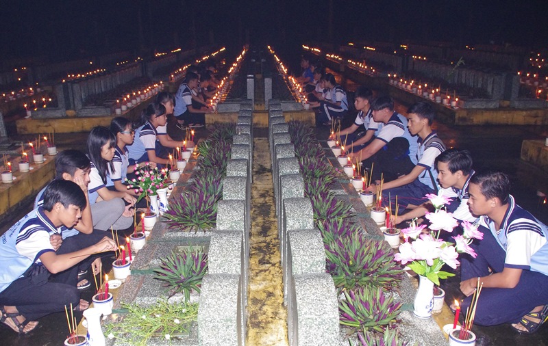 Đã đến giờ “Thắp nến tri ân”. Hơn 1.000 người gồm thân nhân các gia đình liệt sĩ, đại biểu tham dự và nhân dân, tất cả đều đứng trật tự, nghiêm trang dưới trời mưa mặc niệm tưởng nhớ các anh hùng liệt sĩ. Kết thúc phần nghi lễ, mọi người toả ra khắp nghĩa trang. Trong bầu không khí tĩnh lặng, ai cũng thành kính thắp hương, thắp nến trên từng phần mộ. Trong phút chốc, cả nghĩa trang bừng sáng lung linh bởi ánh lửa từ hàng ngàn ngọn nến.