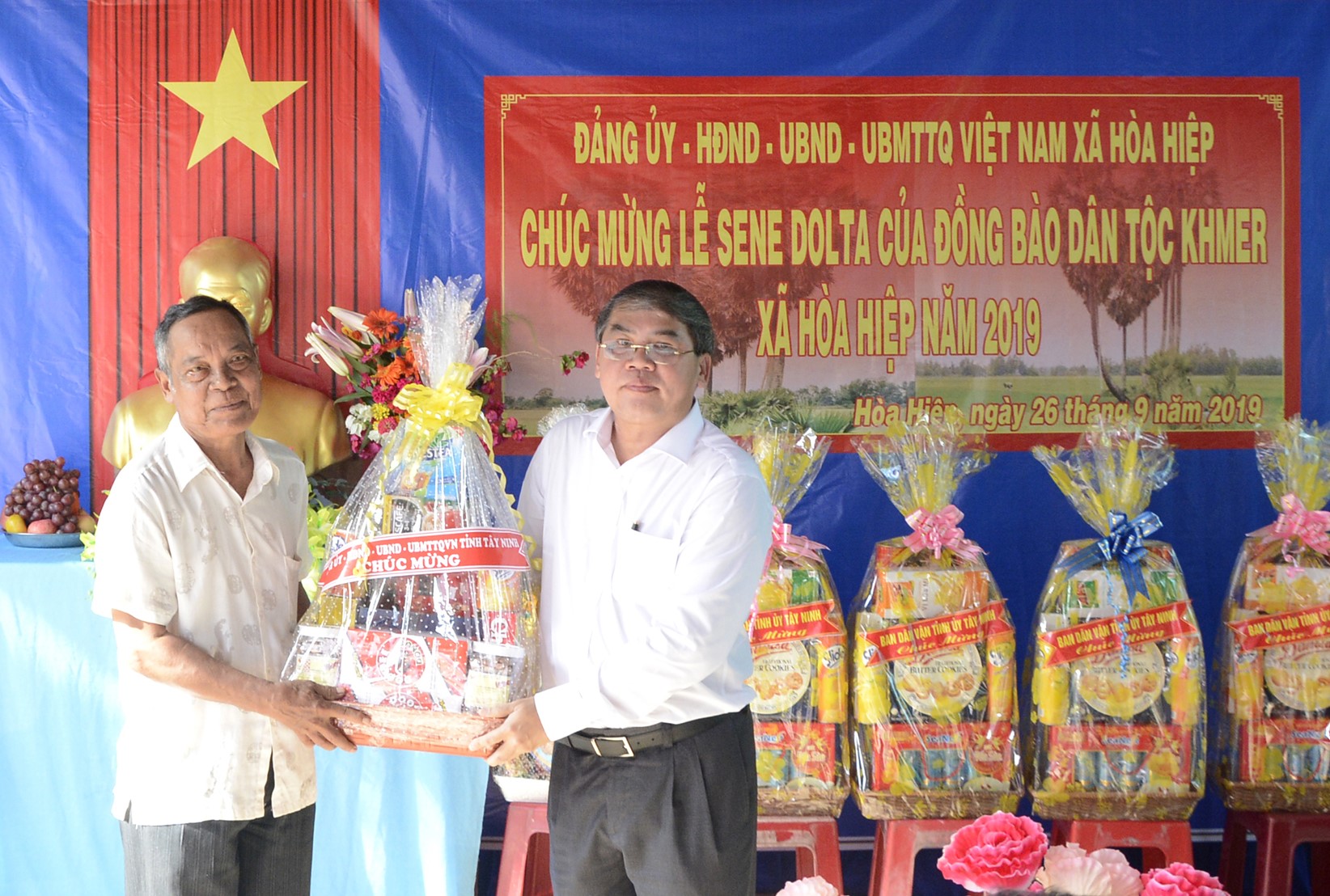 Chiều 26.9, Phó Chủ tịch HĐND tỉnh Nguyễn Thanh Phong cùng đại diện lãnh đạo Uỷ ban MTTQVN tỉnh, các sở, ban, ngành tỉnh đến chúc mừng và chung vui cùng bà con Khmer ấp Hoà Đông A, xã Hoà Hiệp, huyện Tân Biên nhân dịp lễ Sen Dolta 2019. Cùng dự còn có ông Trịnh Ngọc Phương- Bí thư Huyện uỷ, ông Võ Hồng Sang- Phó Chủ tịch UBND huyện.