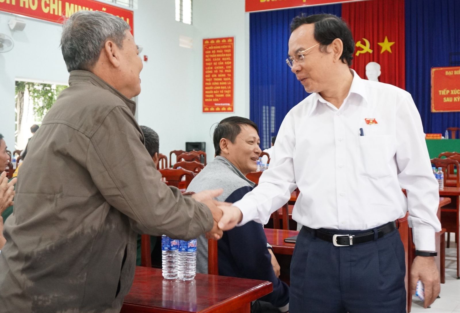 Ông Nguyễn Văn Nên chào hỏi cử tri trước hội nghị.