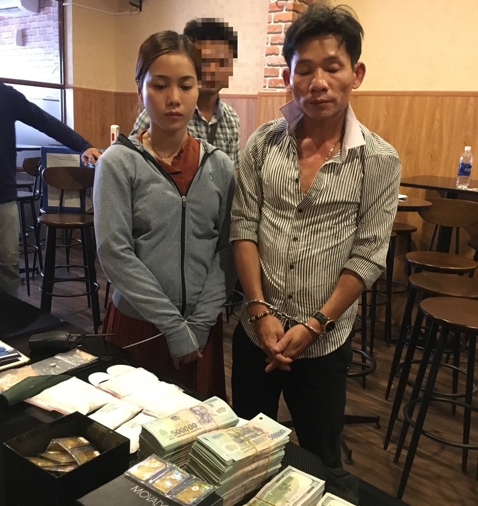 Đối tượng Phùng Hồng Huy và vợ là Nguyễn Thị Ngọc Thuỷ cùng tang vật vụ án khi bị bắt.