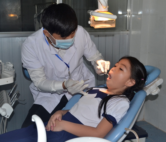 Học sinh Trường tiểu học thị trấn Dương Minh Châu khám răng tại phòng nha của trường.