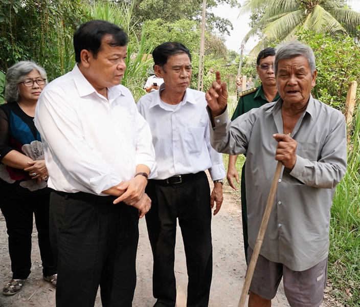 Chủ tịch UBND tỉnh Phạm Văn Tân (bên trái) gặp gỡ người dân địa phương để tìm hiểu thêm về di tích Rạch Tràm- Phước Chỉ.