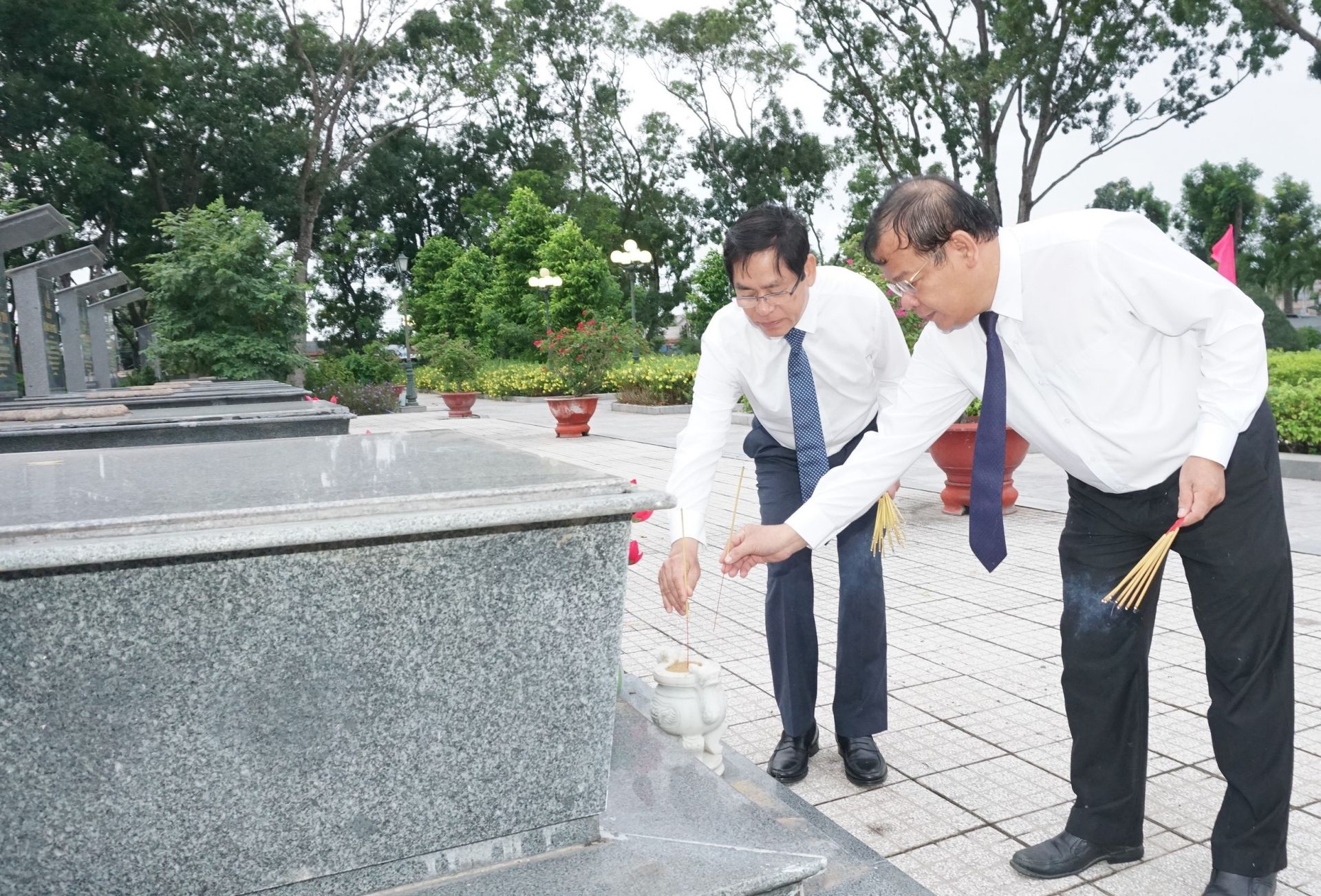 Bí thư Tỉnh uỷ Phạm Viết Thanh (bên trái) và Chủ tịch UBND tỉnh Phạm Văn Tân thắp hương các phần mộ liệt sĩ.