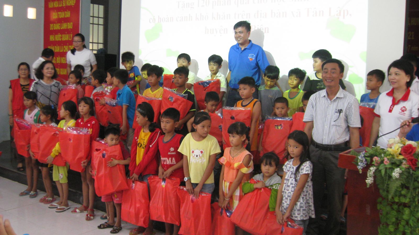 Tặng quà cho học sinh nghèo xã Tân Lập. |