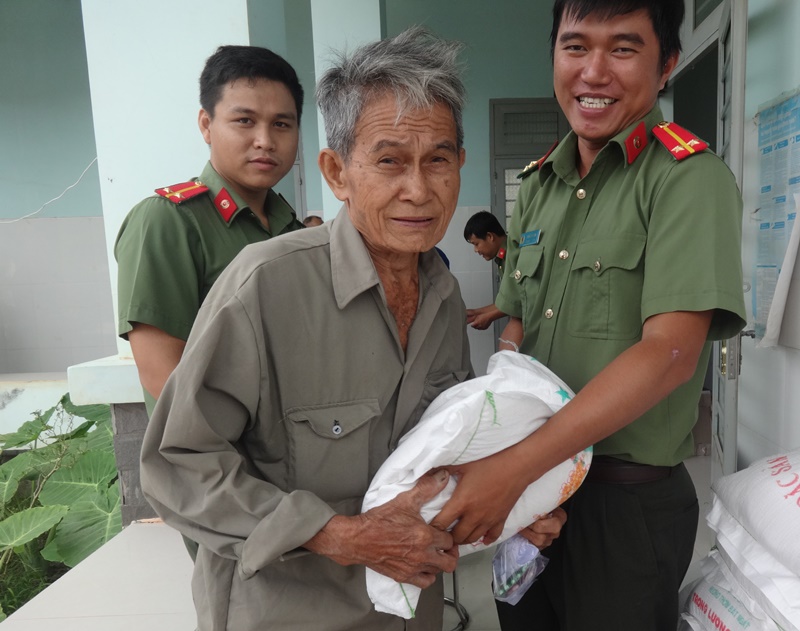 Chiến sĩ Công an Tây Ninh tặng quà cho người dân. |