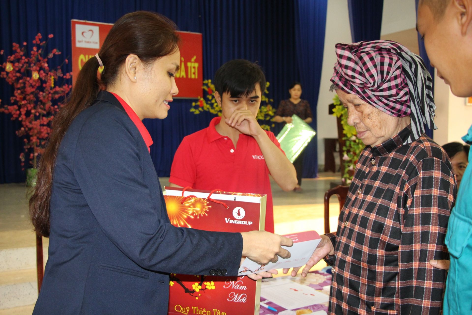 Đại diện Quỹ Thiện Tâm- Tập đoàn Vingroup trao quà cho bà con nghèo.