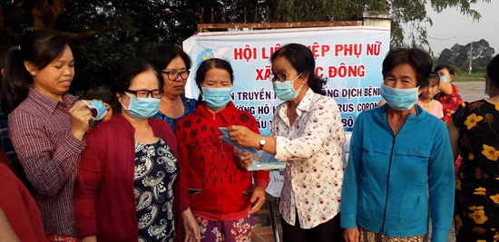 Lãnh đạo Hội LHPN xã Phước Đông cấp phát và hướng dẫn cách mang khẩu trang.