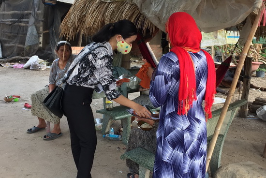 Cán bộ MTTQVN phường 1 phát tờ rơi tuyên truyền dịch bệnh Covid-19 cho đồng bào dân tộc Chăm.