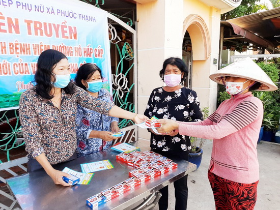 Hội LHPN xã Phước Thạnh phát khẩu trang, xà phòng, tờ rơi tuyên truyền phòng chống dịch Covid-19.