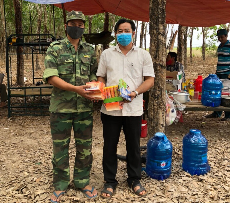 Ông Lâm Văn Xây-Chủ tịch UB.MTTQVN xã thăm hỏi về tình hình trên tuyến biên giới trong những ngày qua, sinh hoạt của các anh em chiến sĩ ở tuyến đầu công tác phòng chống dịch Covid-19, động viên các chiến sĩ cố gắng cùng với hệ thống chính trị địa phương thực hiện tốt nhiệm vụ phòng, chống dịch.