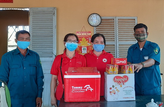 * Hội Chữ thập đỏ huyện Châu Thành vừa đến thăm, động viên và tặng thực phẩm (trứng, cá…) cùng 500 ngàn đồng cho các lực lượng đang thực hiện nhiệm vụ phòng chống dịch tại chốt dân quân thuộc xã Hòa Hội, huyện Châu Thành.