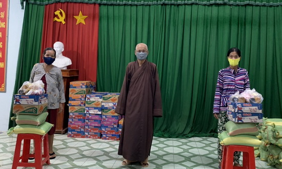 Đại đức Thích Nhuận Minh- trụ trì chùa Linh Bửu trao quà cho hộ nghèo.