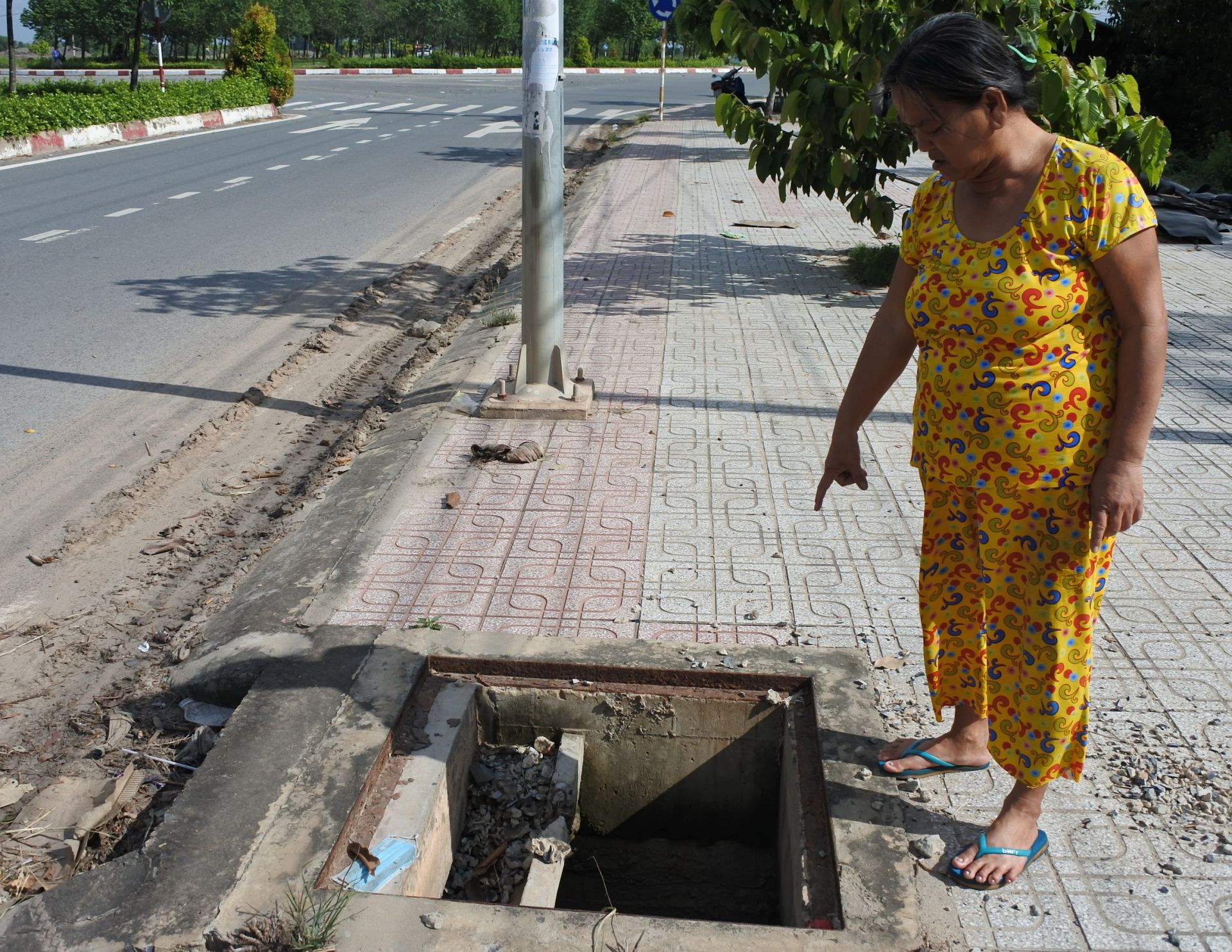 Người dân địa phương chỉ một nắp cống vừa bị kẻ gian đập phá, lấy mất. Ảnh chụp vào sáng 22.8.2020