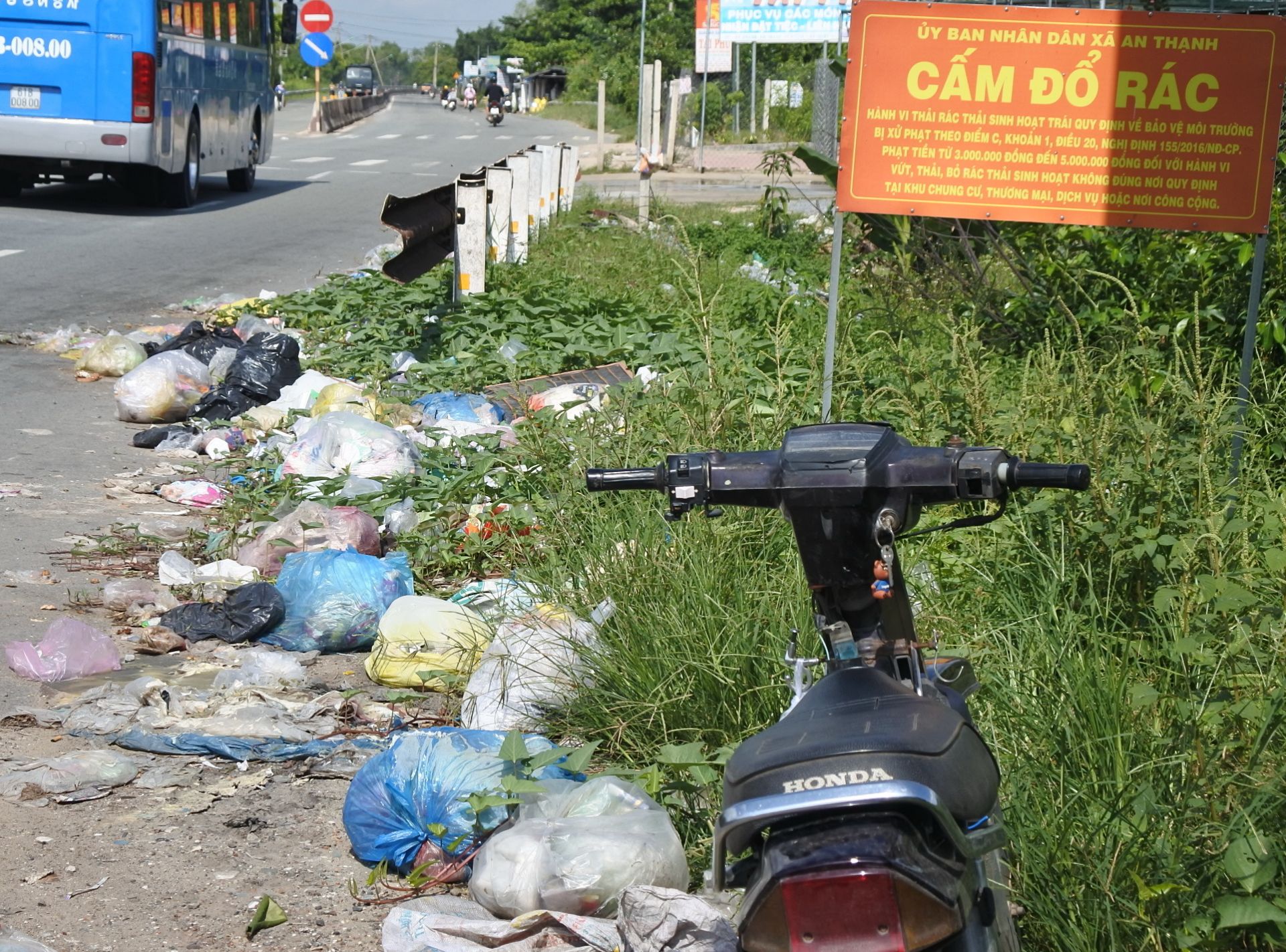 Rác tràn ra cả mặt đường, xã An Thạnh cũng đã cho cắm biển “cấm đổ rác” kèm theo với các mức phạt cụ thể, tuy nhiên đến nay bãi rác này vẫn tồn tại, chưa được xử lý dứt điểm.