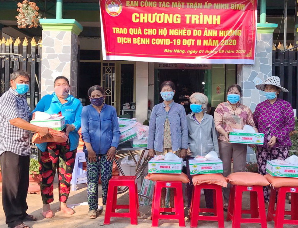 * Mới đây, Ban Công tác mặt trận ấp Ninh Bình, xã Bàu Năng, huyện Dương Minh Châu tổ chức trao tặng 100 phần quà, mỗi phần trị giá 250.000 đồng, gồm gạo, mì gói và các nhu yếu phẩm khác. Tổng số số tiền trao quà là 25 triệu đồng, do bà Trần Thị Lụa, ngụ tổ 11 ấp Ninh Bình, xã Bàu Năng hỗ trợ.