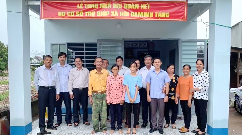 Lãnh đạo địa phương và đơn vị tài trợ trao nhà đại đoàn kết cho ông Len.