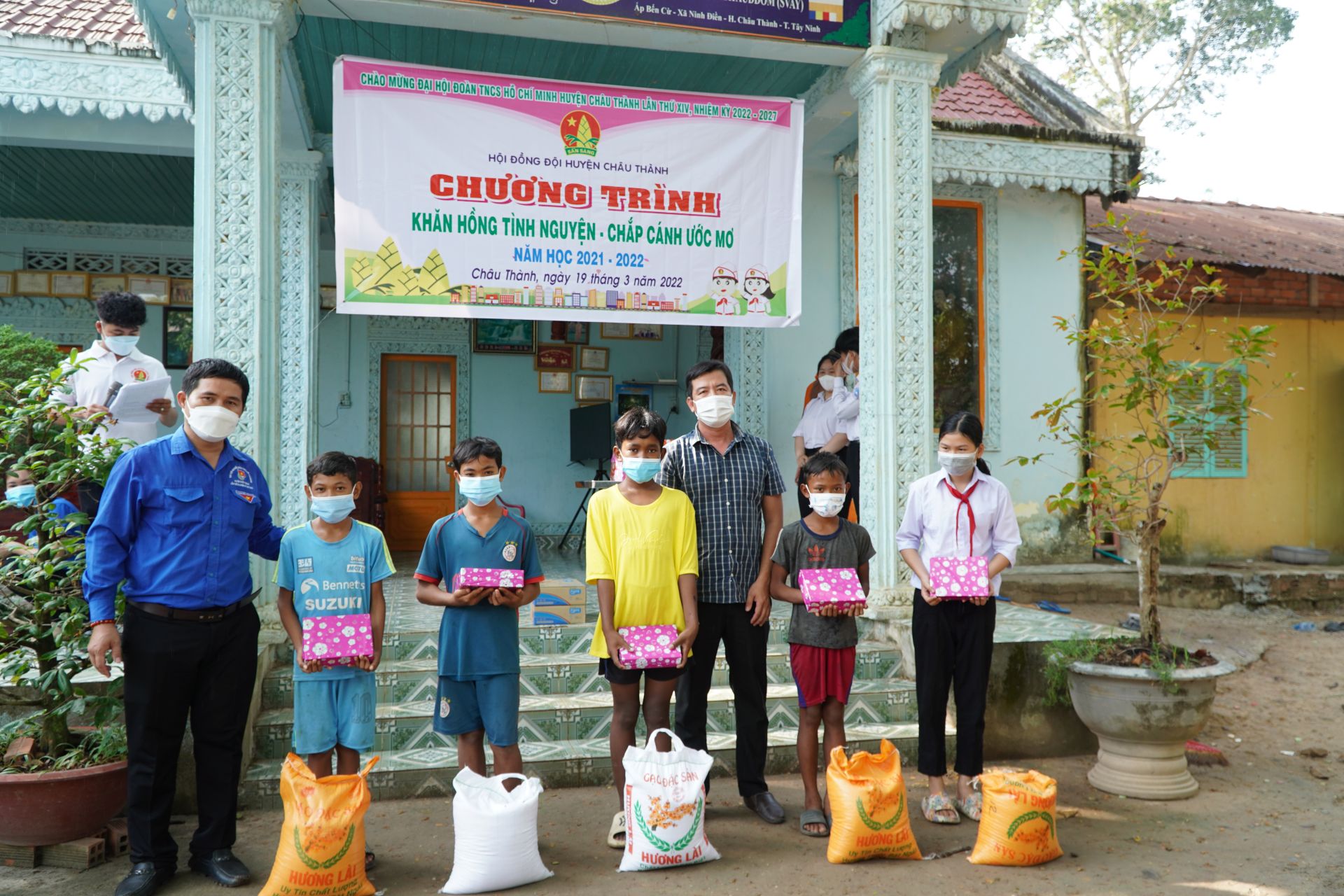 Tại chương trình, Hội đồng Đội huyện Châu Thành trao tặng 11 suất học bổng, mỗi suất 300.000 đồng, 40 phần quà là tập trắng và 10 phần quà, mỗi phần 10kg gạo cho các em học sinh, thiếu nhi là người dân tộc thiểu số, có hoàn cảnh khó khăn trên địa bàn xã Ninh Điền.