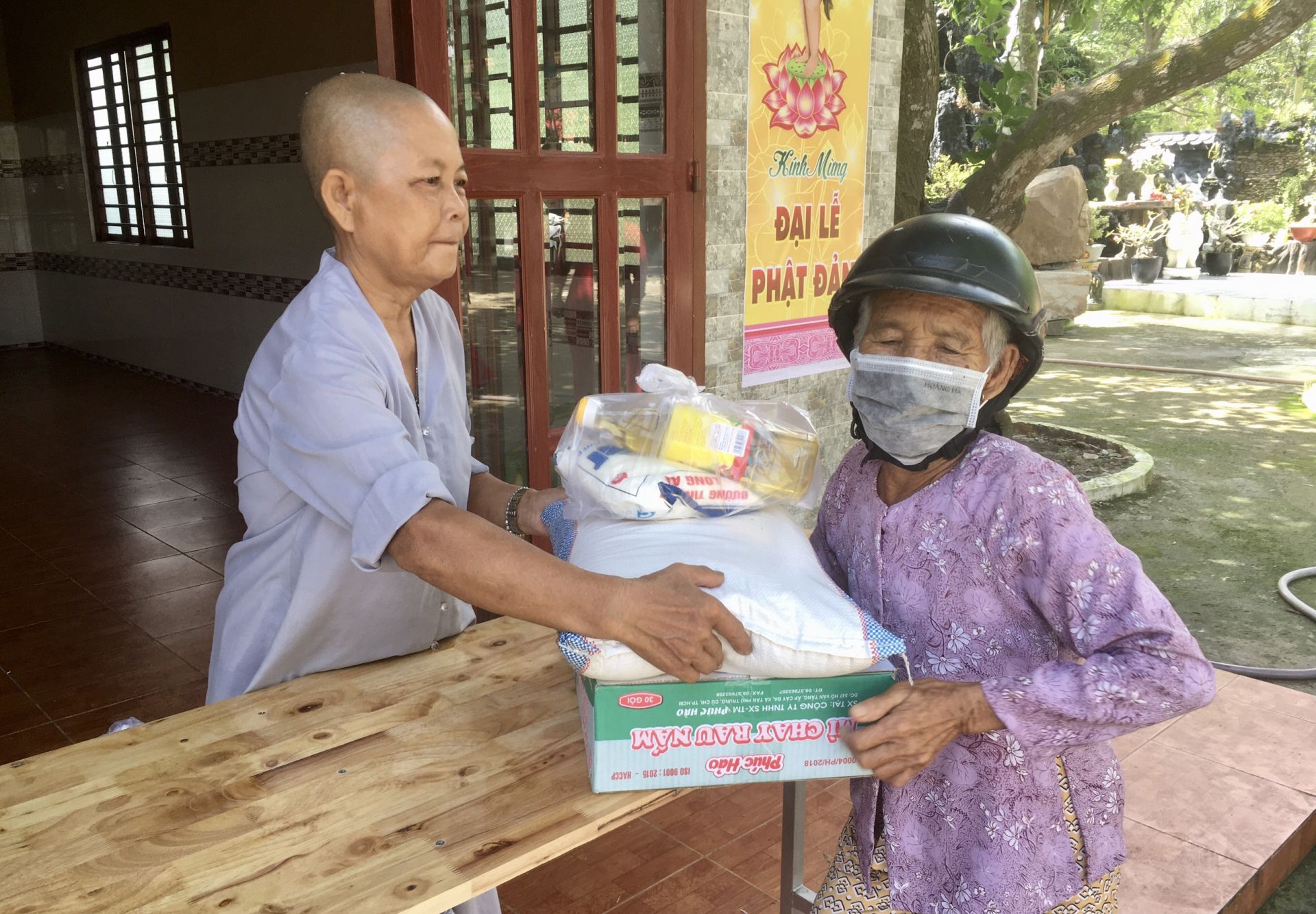 Phật tử chùa Hiệp Long trao quà cho hộ nghèo.