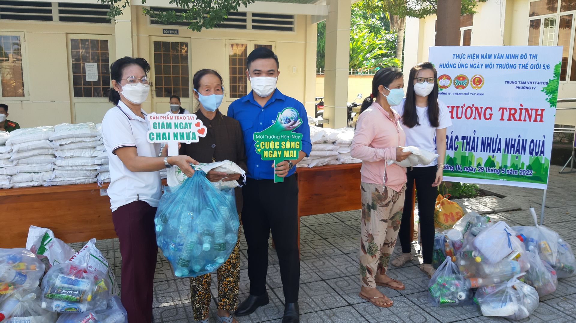 Tại chương trình, hơn 70kg rác thải nhựa trong sinh hoạt gia đình như vỏ đồ hộp, vỏ lon bia, chai nhựa… được người dân mang đến để đổi quà. Số rác thải nhựa sẽ Đoàn Thanh niên phường IV bán phế liệu, tiền thu được để trao học bổng cho học sinh nghèo hiếu học trên địa bàn. Ngoài ra, Đoàn phường IV còn phối hợp Đoàn cơ sở Công an Thành phố trao tặng 10 phần quà cho thanh niên công nhân có hoàn cảnh khó khăn trên địa bàn phường, mỗi phần quà trị giá 500.000 đồng.