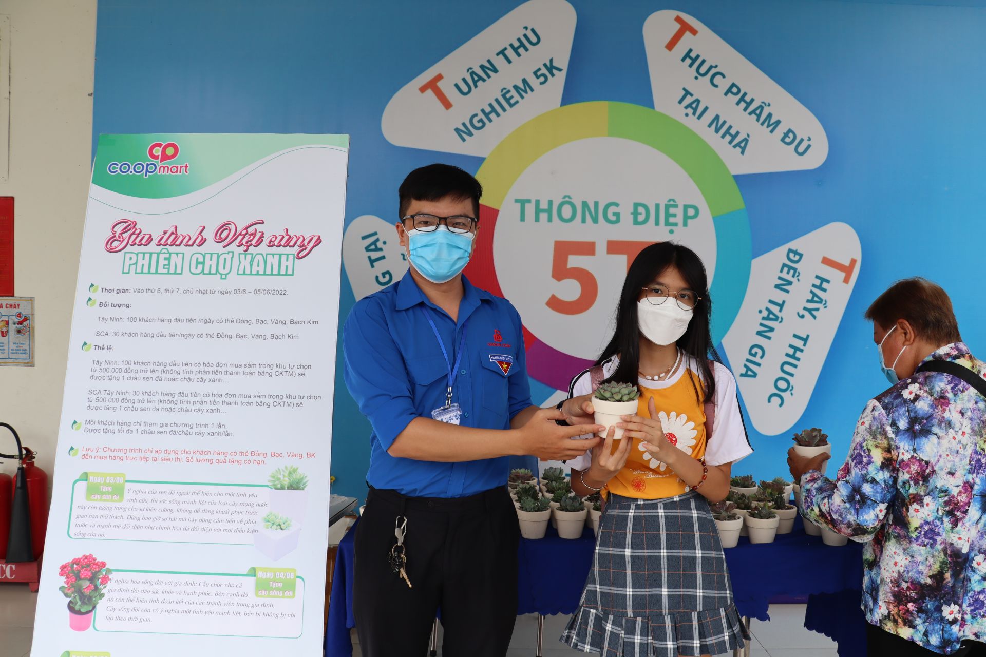 ĐVTN, nhân viên Siêu thị Co.opmart Tây Ninh tặng cây xanh cho khách hàng.
