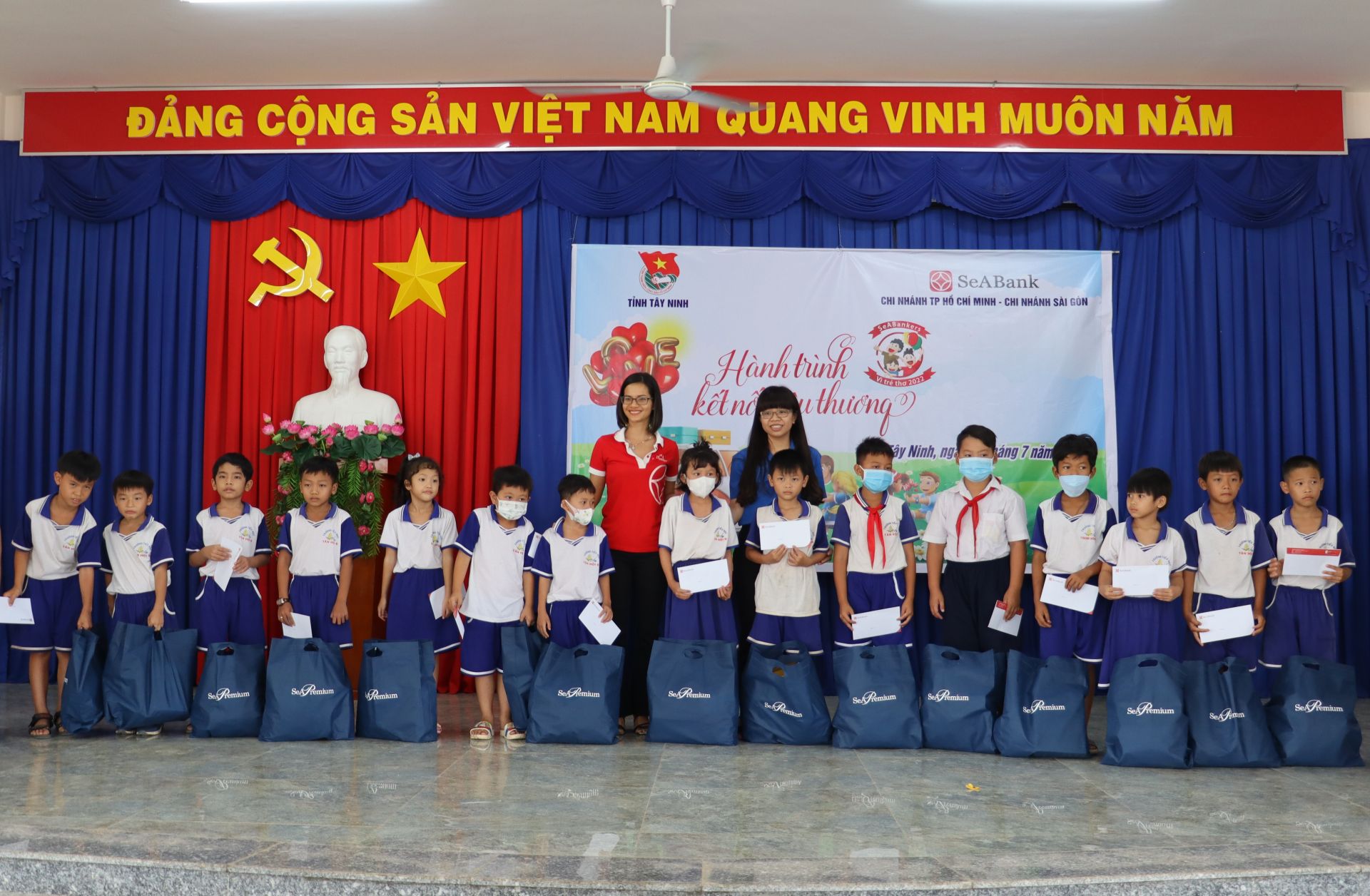 Đoàn trao tặng 80 phần quà cho các em thiếu nhi, học sinh có hoàn cảnh khó khăn. Mỗi phần quà trị giá 500 ngàn đồng, bao gồm: bánh kẹo, dụng cụ học tập, cặp sách và 1 suất học bổng. Tổng trị giá quà tặng 40 triệu đồng, do Ngân hàng TMCP Đông Nam Á (SeaBank) Chi nhánh Thành phố Hồ Chí Minh và Chi nhánh Sài Gòn tài trợ.