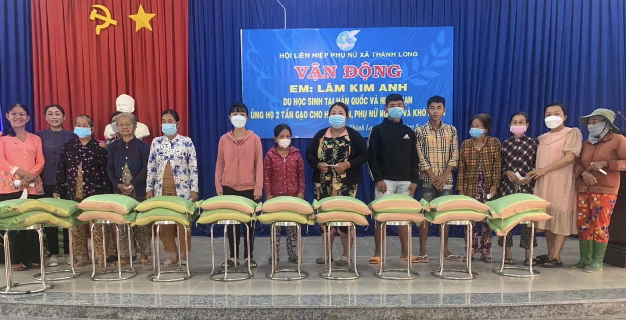 Số gạo này do chị Lâm Kim Anh, du học sinh tại Hàn Quốc cùng nhóm bạn hỗ trợ cho Hội LHPN xã Thành Long. Hội tổ chức trao cho 100 hội viên, phụ nữ nghèo trên địa bàn xã, mỗi hộ được 20kg gạo.