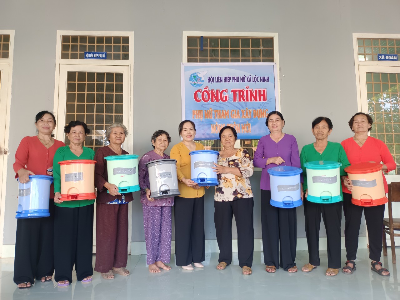Hội LHPN xã Lộc Ninh trao thùng rác cho hội viên.
