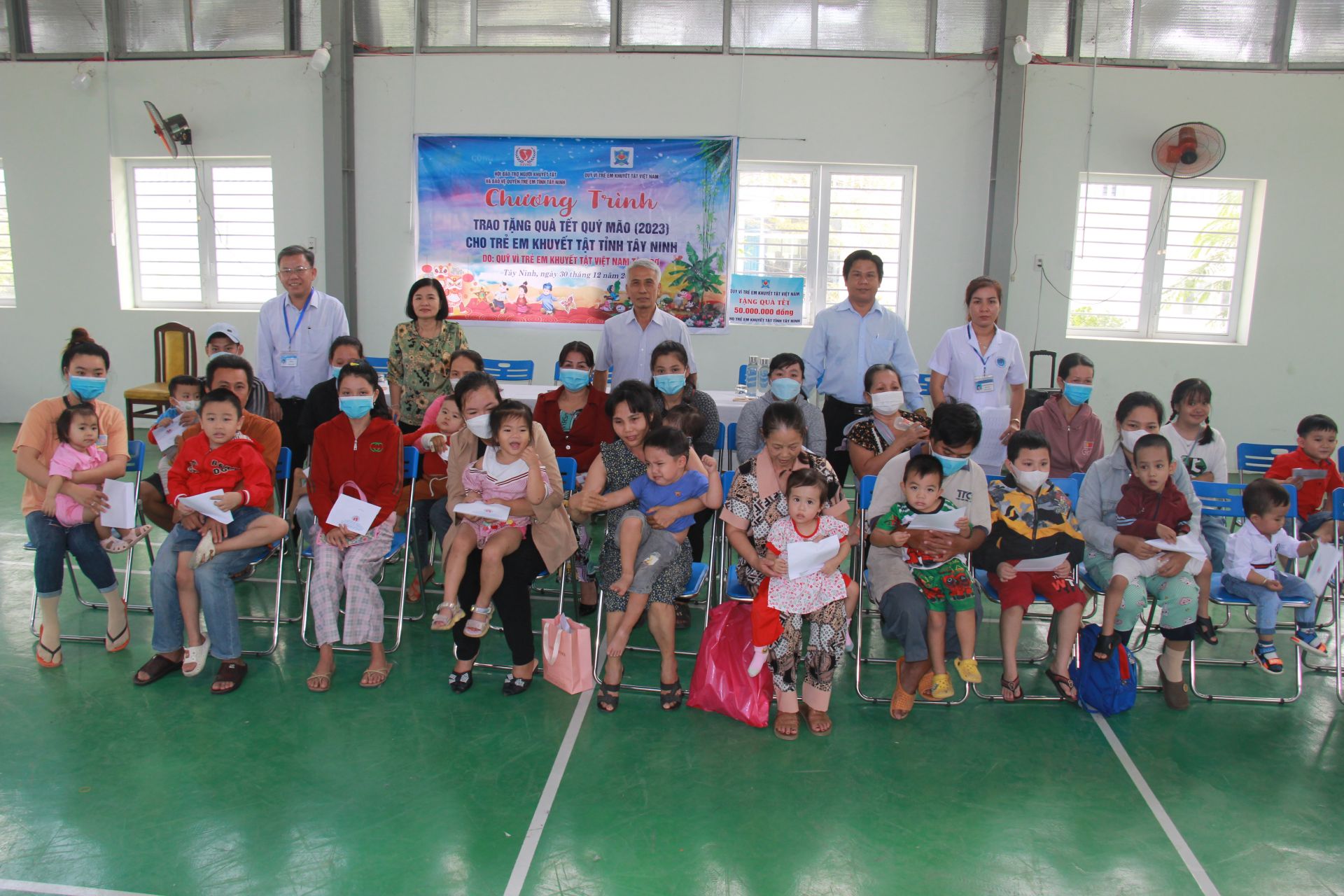 Có 100 suất quà được trao cho 100 cháu, mỗi suất là 500.000 đồng tiền mặt, do Quỹ Vì trẻ em khuyết tật Việt Nam tài trợ. Trong đó, 30 cháu đang được điều trị tại Bệnh viện Phục hồi chức năng; 27 cháu thuộc cơ sở Mái ấm Mây Ngàn chùa Cẩm Phong; 43 cháu thuộc Trung tâm Nghiên cứu phát triển trị liệu tâm lý trẻ Nhân Tâm trụ sở tại phường 3, TP. Tây Ninh.