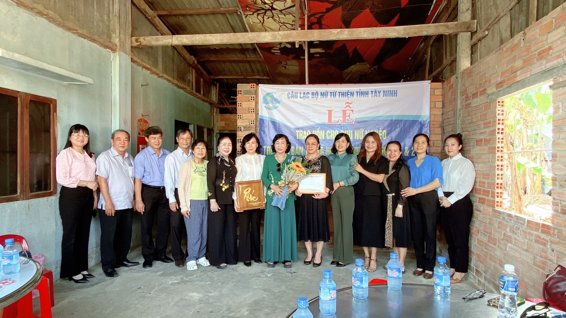 Lãnh đạo địa phương chụp ảnh lưu niệm cùng các thành viên CLB Nữ từ thiện.
