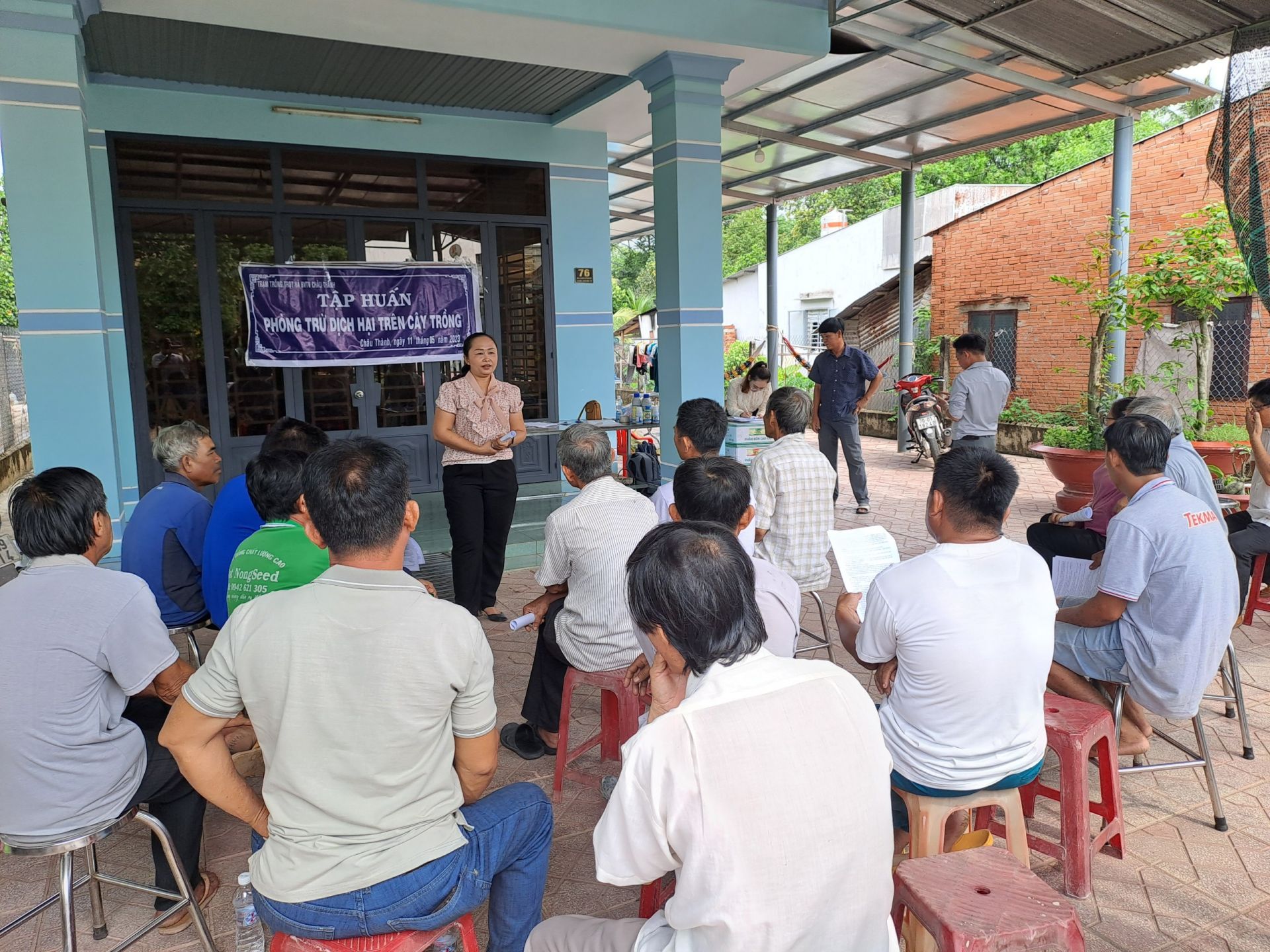 Báo cáo viên tập huấn kỹ thuật trồng lúa, cách chăm sóc, phòng trừ dịch bệnh trên cây trồng cho hội viên.