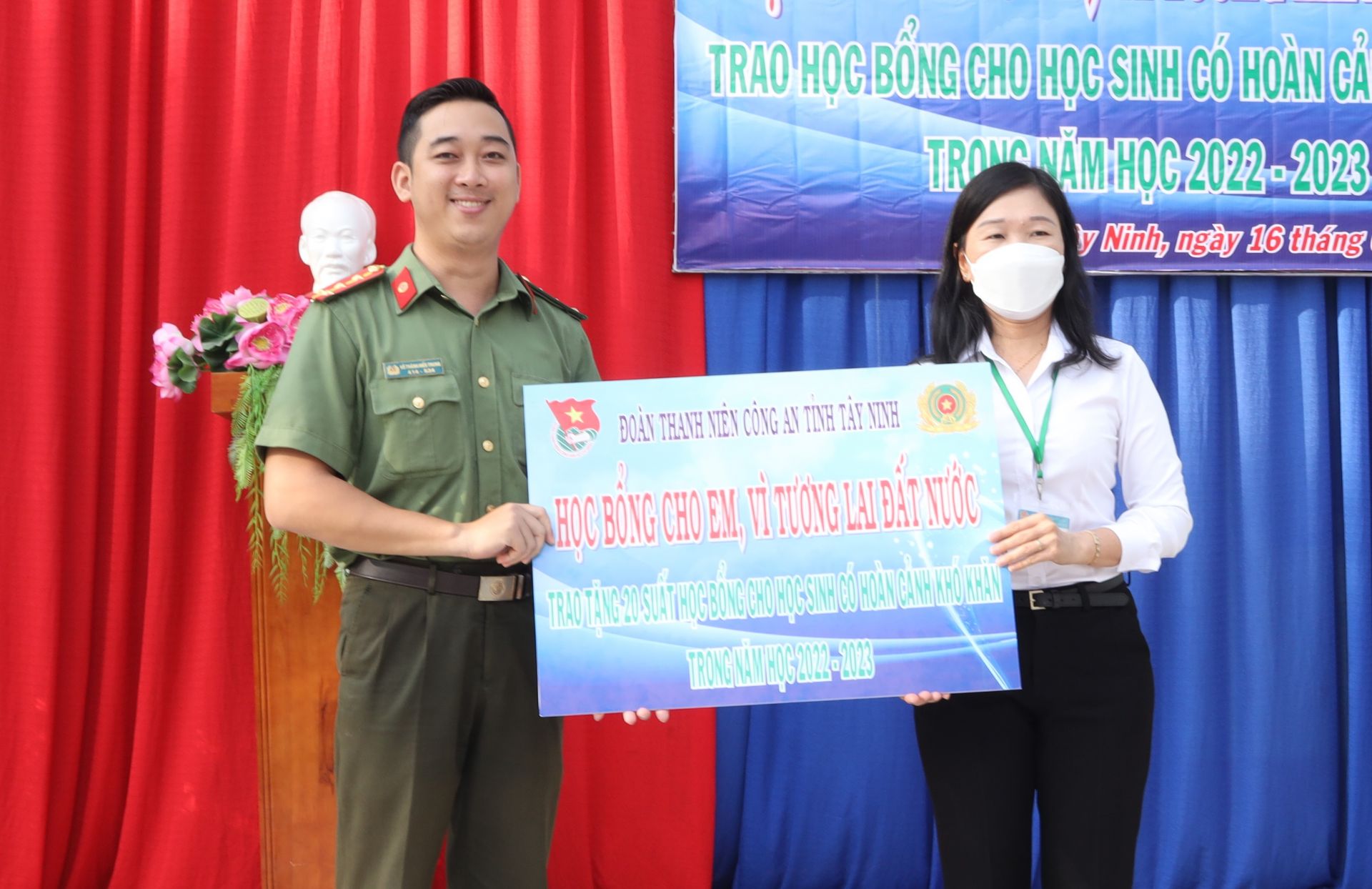 Đại uý Võ Thành Hiếu Trung- Phó Bí thư Đoàn Thanh niên CATN trao 20 suất học bổng cho 20 học sinh nghèo hiếu học, mỗi suất trị có giá 500.000 đồng. Đây là hoạt động nằm trong chương trình “Học bổng cho em, vì tương lai đất nước” do Đoàn Thanh niên Công an tỉnh phát động nhằm kịp thời chia sẻ, hỗ trợ các em học sinh có hoàn cảnh khó khăn có thêm động lực để tiếp tục vươn lên, đạt kết quả tốt trong học tập và rèn luyện.