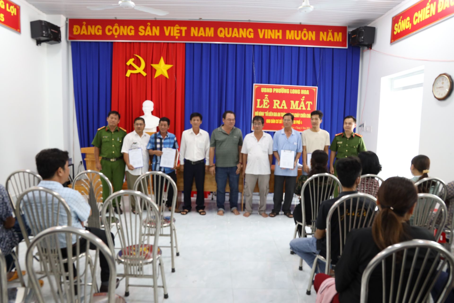 Ông Trần Thủ Nghiệp- Chủ tịch UBND phường Long Hoa và Công an thị xã Hoà Thành chụp ảnh cùng Tổ liên gia an toàn PCCC tổ số 10 tại khu phố 4, phường Long Hoa.