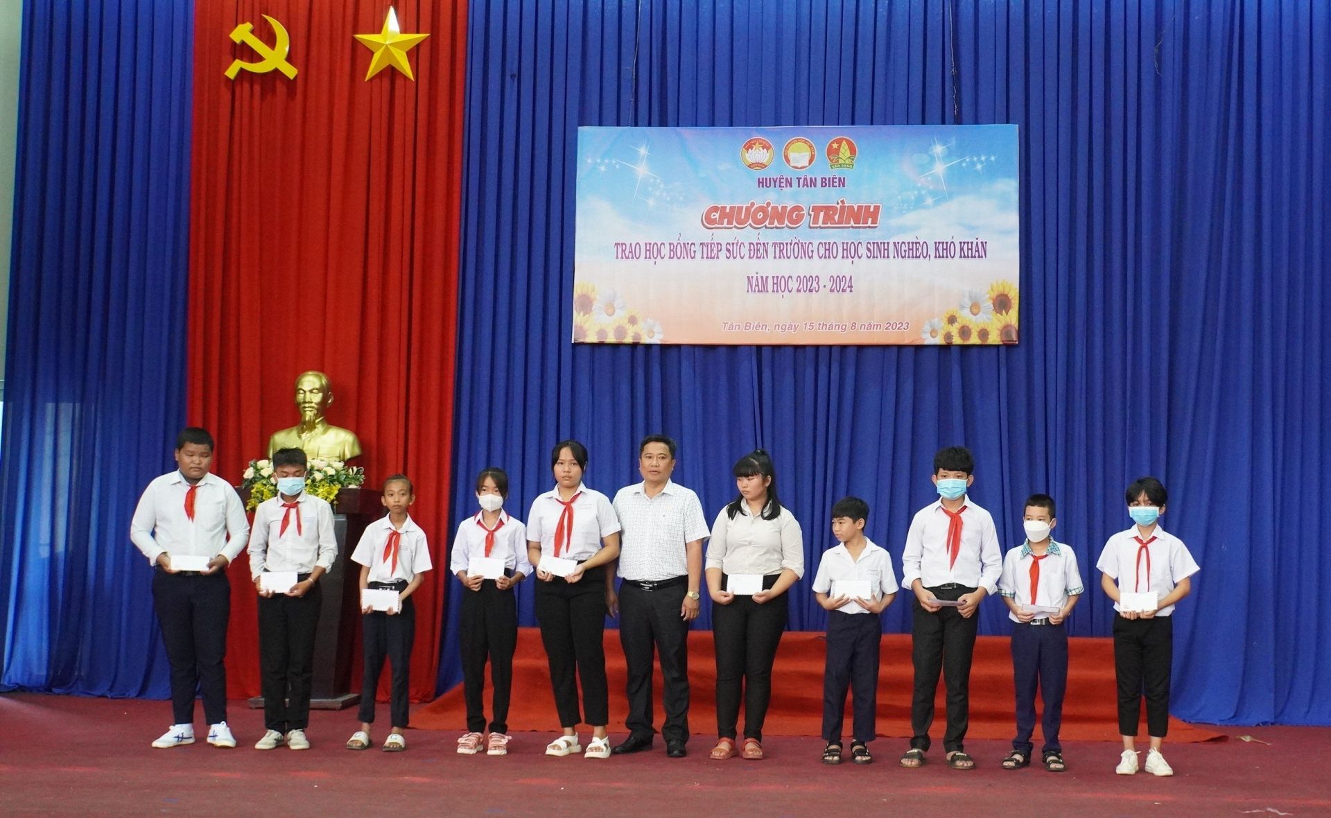 * Sáng 15.8, UBMTTQVN huyện Tân Biên phối hợp Huyện đoàn và Hội Khuyến học huyện tổ chức trao học bổng cho học sinh tại 12 trường THCS trên địa bàn huyện có hoàn cảnh đặc biệt khó khăn.