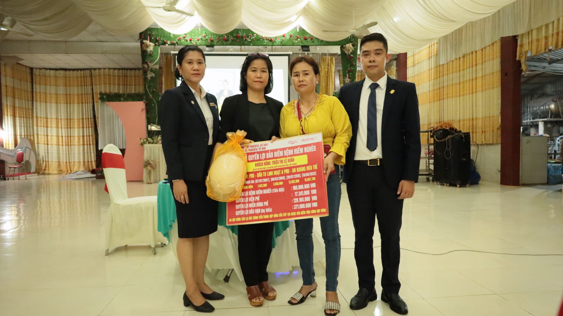 Prudential Tây Ninh chi trả cho khách hàng Triệu Thị Lệ Xuân, ngụ ấp Phước Bình 1, xã Suối Đá, huyện Dương Minh Châu. Bà Triệu Thị Lệ Xuân tham gia 5 hợp đồng bảo hiểm nhân thọ (1 hợp đồng đã đáo hạn, 1 hợp đồng tham gia trên 5 năm, 2 hợp đồng tham gia trên 10 năm và một hợp đồng mới tham gia năm 2022, kèm theo thẻ bảo lãnh viện phí có tên “Pru Hành trang vui khoẻ”).