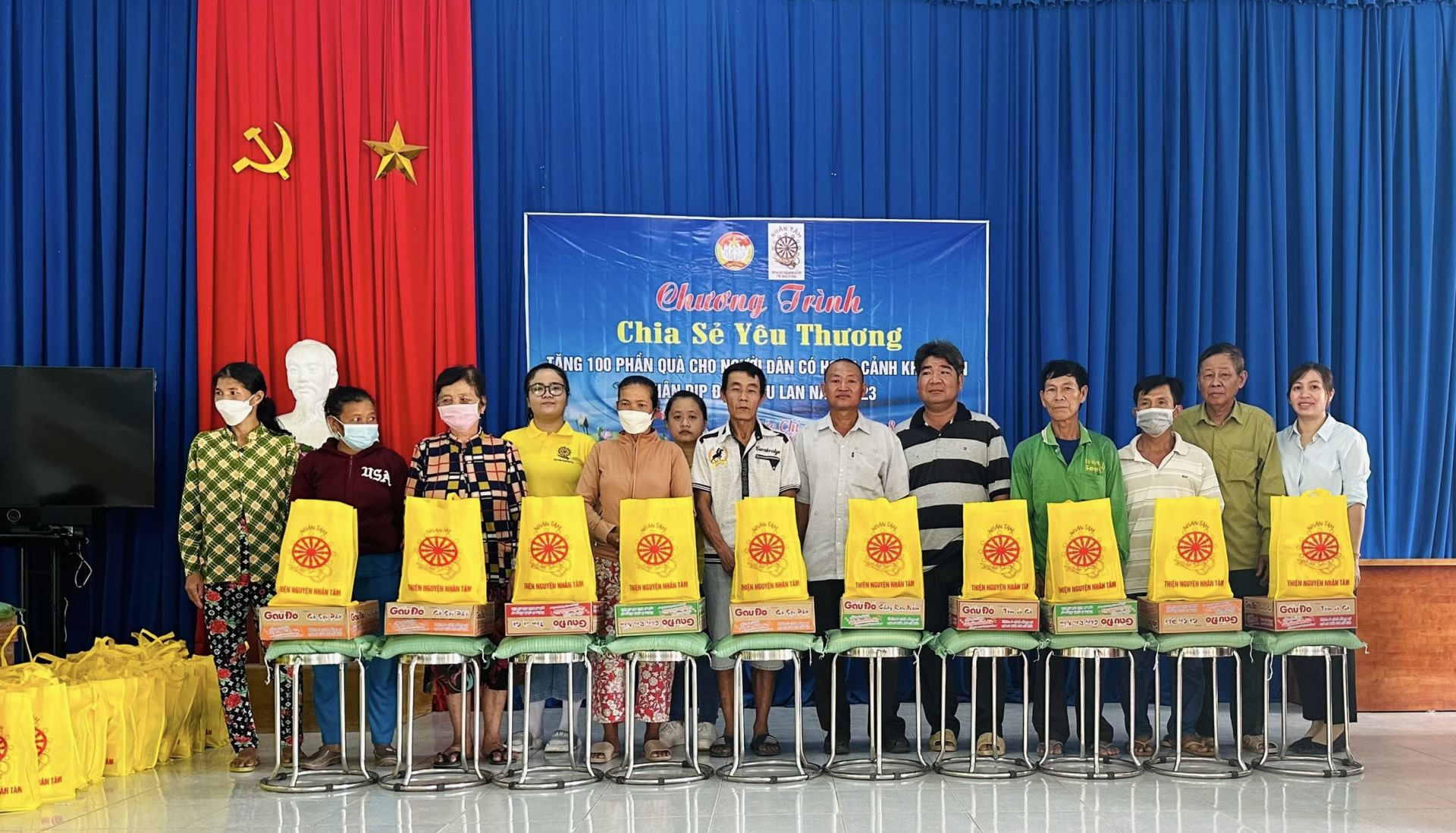 Có 100 phần trao tặng cho các hộ nghèo, hộ có hoàn cảnh khó khăn. Mỗi phần trị giá 300.000 đồng gồm các nhu yếu phẩm.