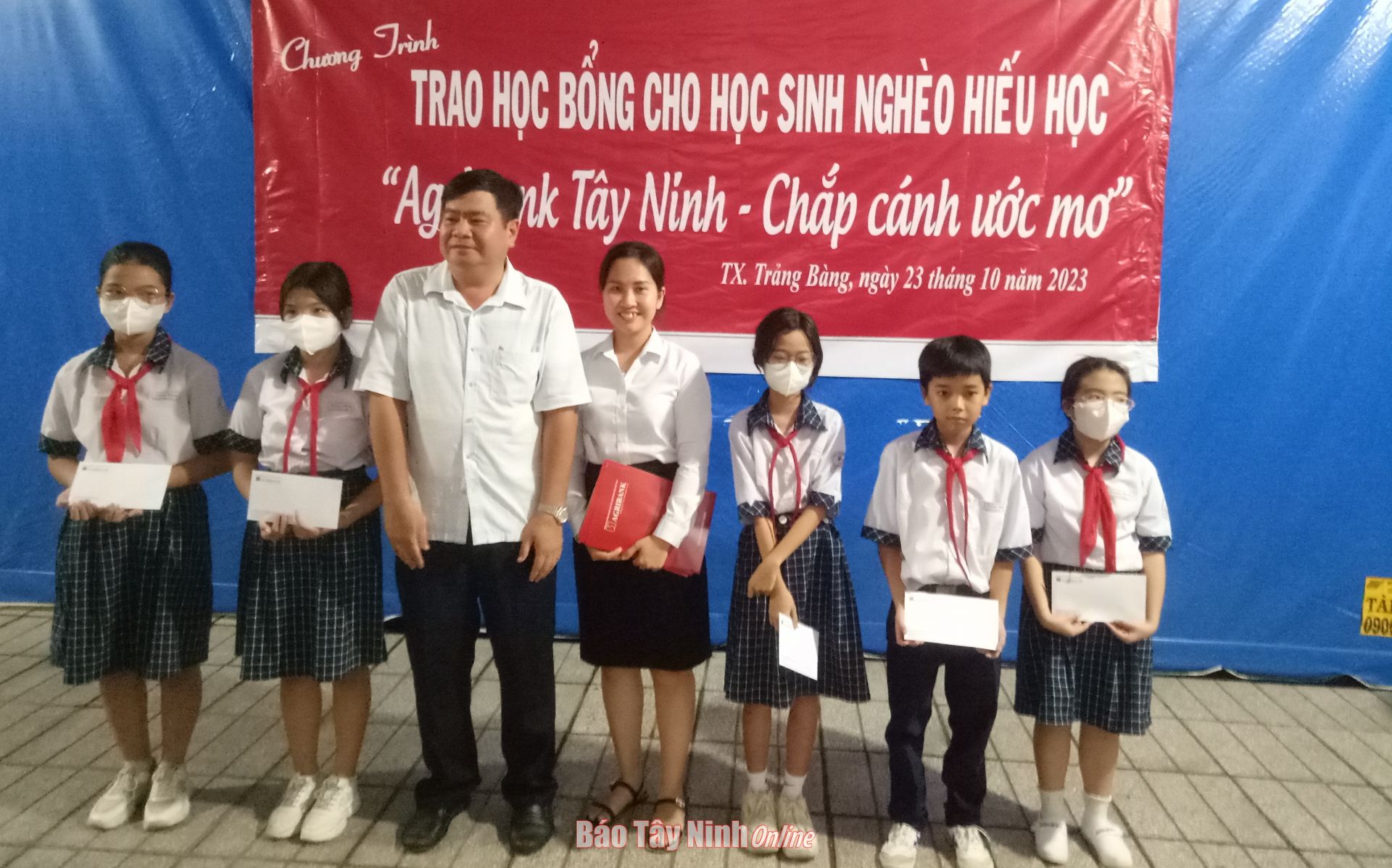 Chương trình trao tặng 20 suất học bổng, mỗi suất trị giá 1 triệu đồng cho các em học sinh có hoàn cảnh khó khăn, đạt thành tích tốt trong học tập. Tổng giá trị 20 triệu đồng do Agribank chi nhánh thị xã Trảng Bàng tài trợ.