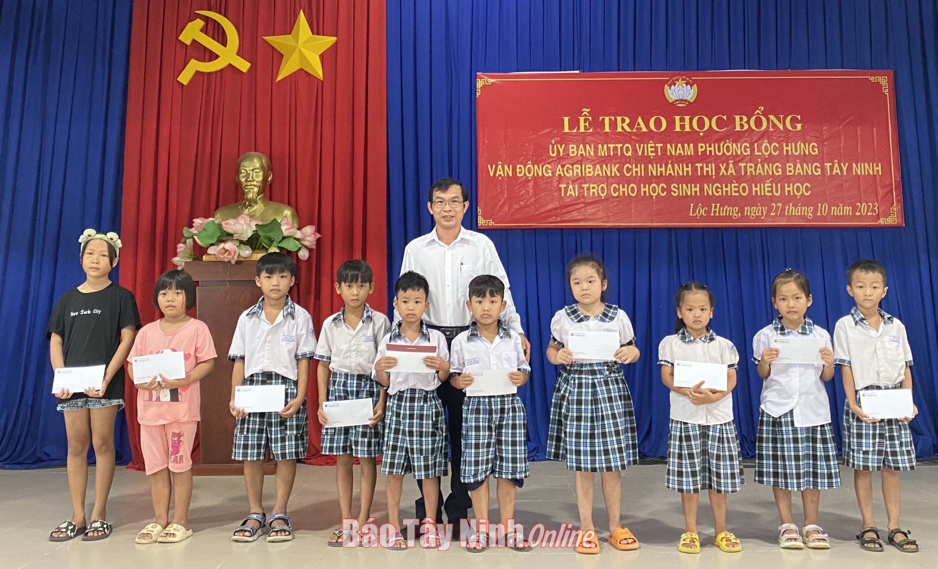 Chiều ngày 27.10, Ngân hàng Nông nghiệp và Phát triển nông thôn (Agribank) chi nhánh thị xã Trảng Bàng trao 40 suất học bổng trị giá 20 triệu đồng cho các em học sinh nghèo hiếu học trên địa bàn phường Lộc Hưng.