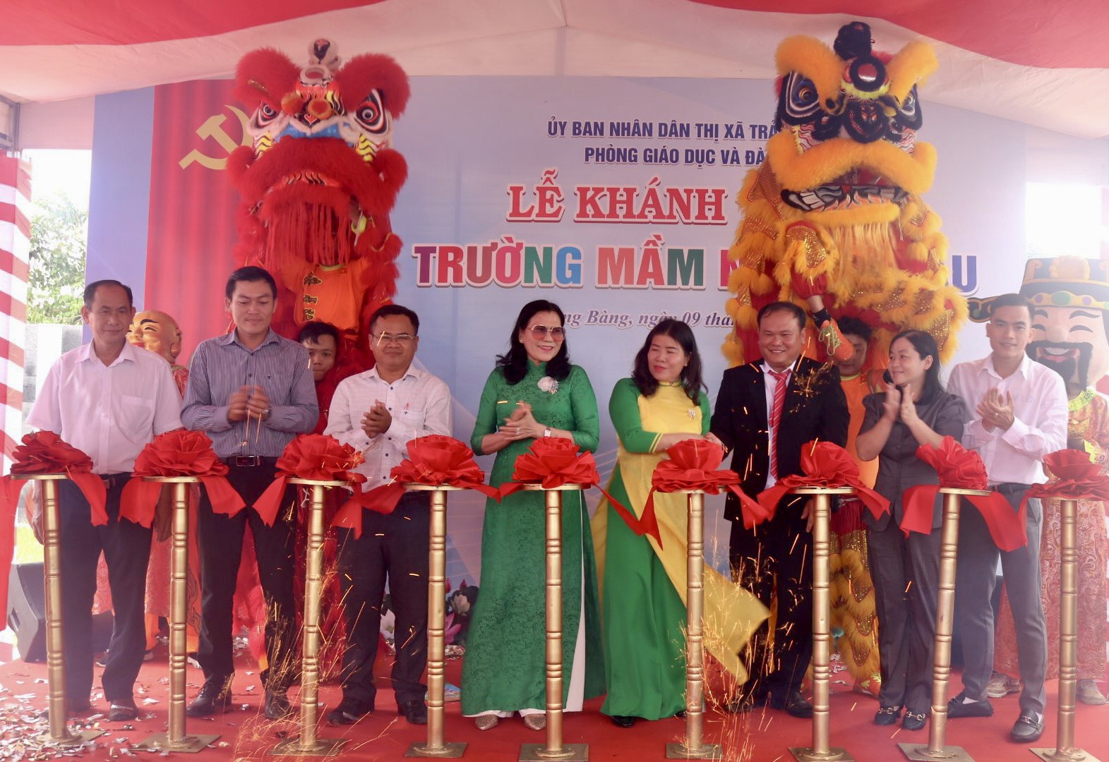 Đại biểu thực hiện nghi thức cắt băng khánh thành Trường mầm non Á Châu.