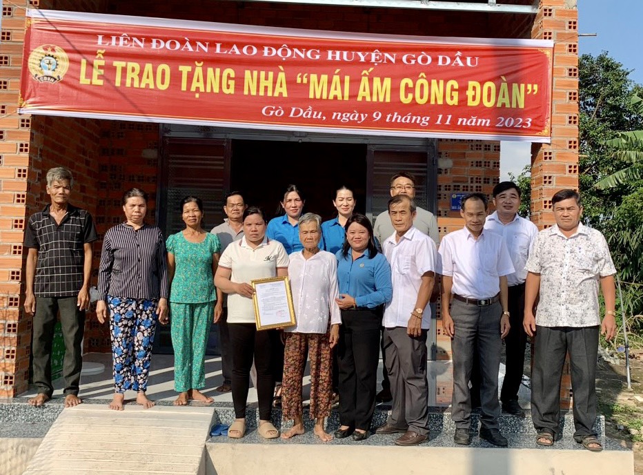 * Mới đây, Liên đoàn Lao động (LĐLĐ) huyện Gò Dầu phối hợp chính quyền địa phương xã Phước Thạnh tổ chức trao tặng nhà mái ấm công đoàn cho đoàn viên Công đoàn cơ sở Công ty cổ phần công nghiệp Federal Bay đang gặp khó khăn về nhà ở. Đến dự có bà Phan Thị Hồng Đào- Phó Chủ tịch LĐLĐ tỉnh.
