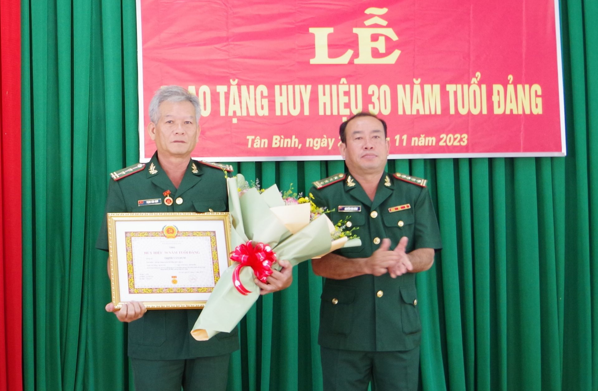 Đại tá Nguyễn Văn Dũng- Phó Chính uỷ Bộ đội Biên phòng Tây Ninh trao tặng Huy hiệu 30 năm tuổi Đảng cho Trung tá QNCN Trịnh Văn Dụm.