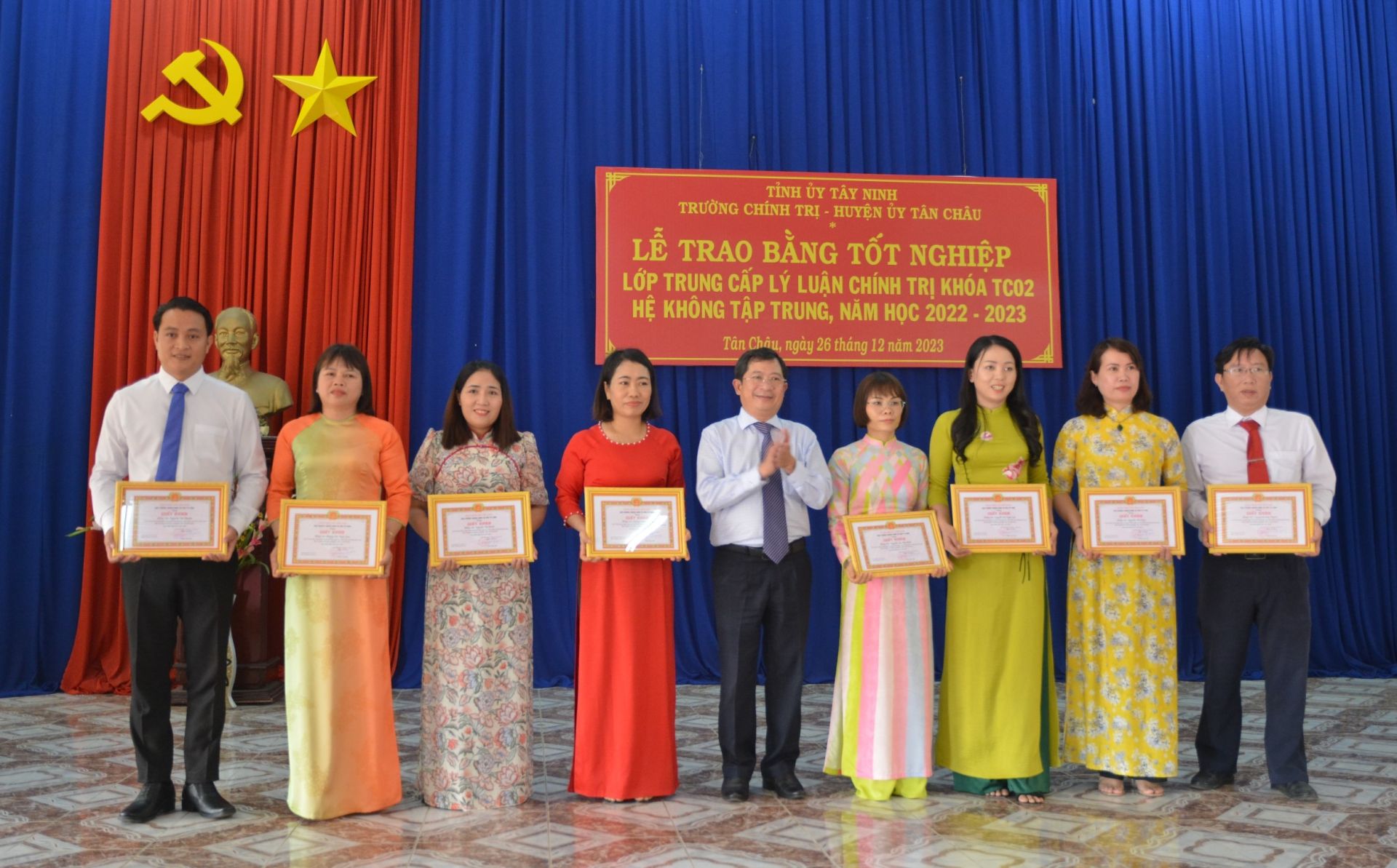 * Chiều 26.12, tại Trung tâm bồi dưỡng chính trị huyện Tân Châu, Trường Chính trị tỉnh phối hợp Huyện ủy Tân Châu tổ chức bế giảng lớp trung cấp lý luận chính trị khóa TC02 năm học 2022- 2023.