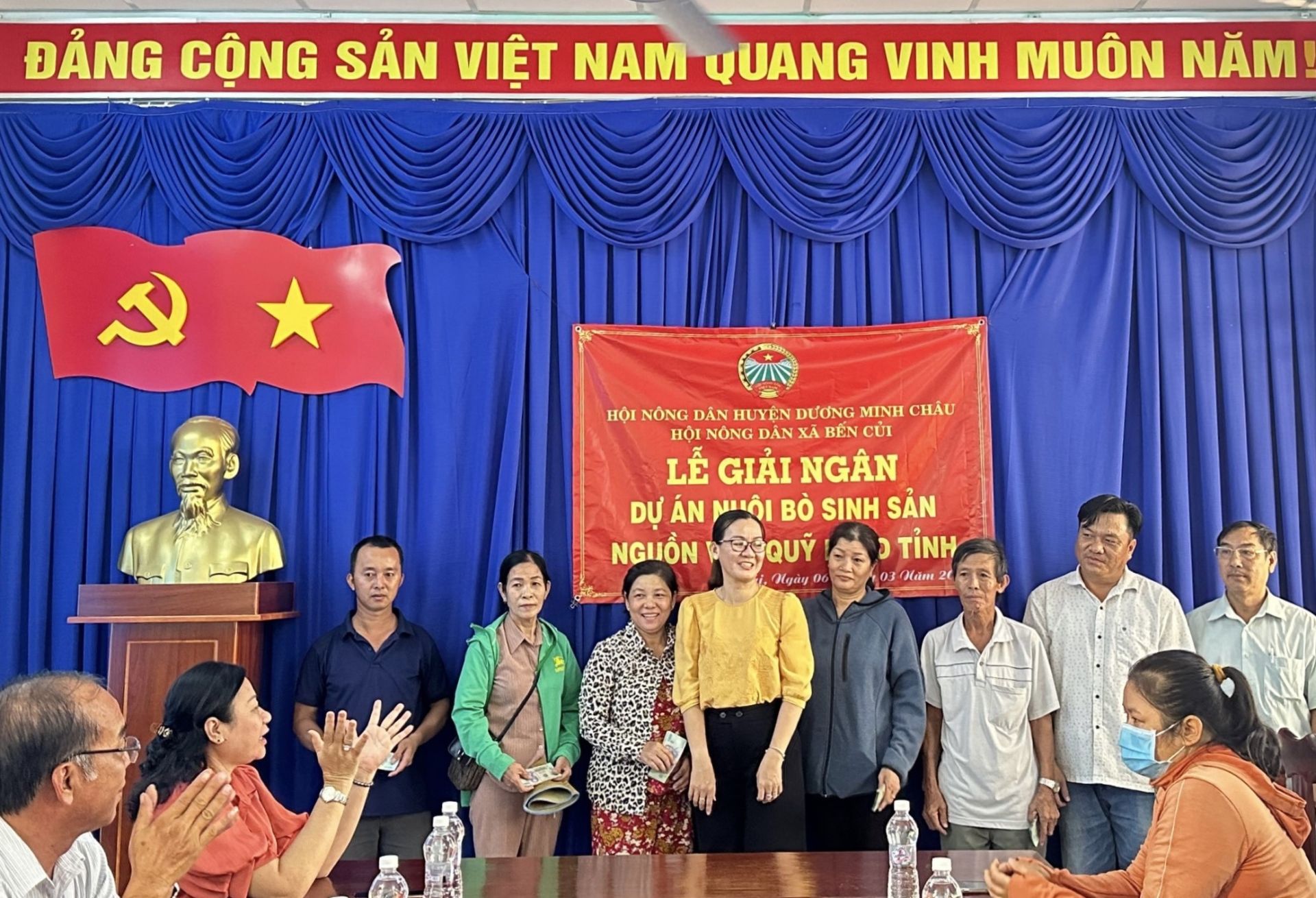 Đại diện Hội Nông dân Huyện Dương Minh Châu giải ngân vốn Quỹ Hỗ trợ nông dân cho các hộ nông dân xã Bến Củi thực hiện dự án chăn nuôi bò sinh sản