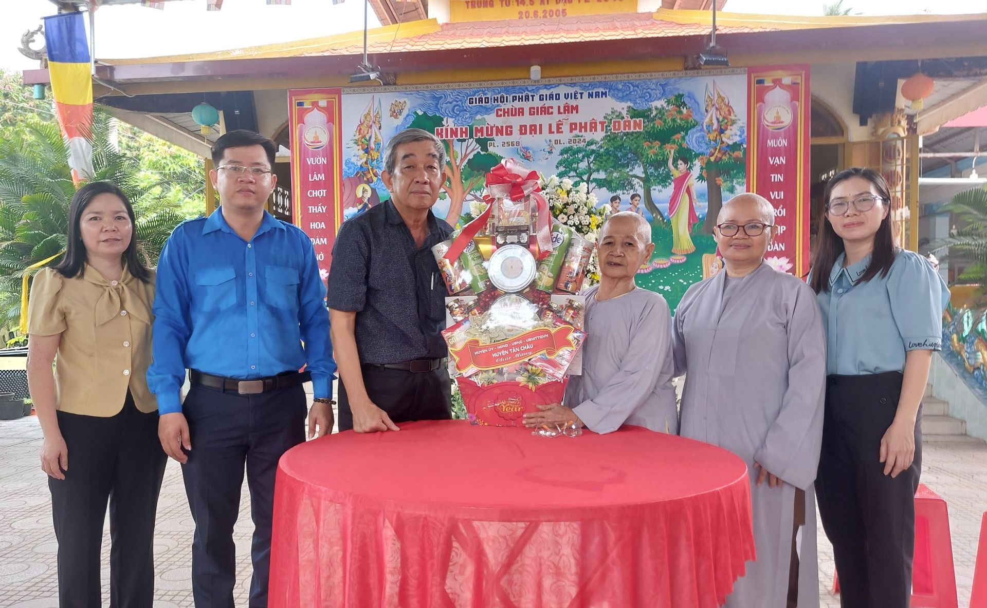 * Nhân dịp Đại lễ Phật đản, Phật lịch 2568, dương lịch 2024, ngày 15.5, đoàn lãnh đạo Huyện uỷ, HĐND, UBND, UBMTTQ Việt Nam huyện Tân Châu do ông Phan Văn Quang - Uỷ viên Ban Thường vụ Huyện uỷ, Trưởng Ban Dân vận Huyện uỷ làm trưởng đoàn đến thăm, chúc mừng tăng ni, phật sử tại chùa An Lạc thị trấn Tân Châu; chùa Hiệp Thành và chùa Giác Lâm xã Tân Hiệp; chùa Chánh Đẳng Giác và chùa Liên Trì xã Tân Hội.