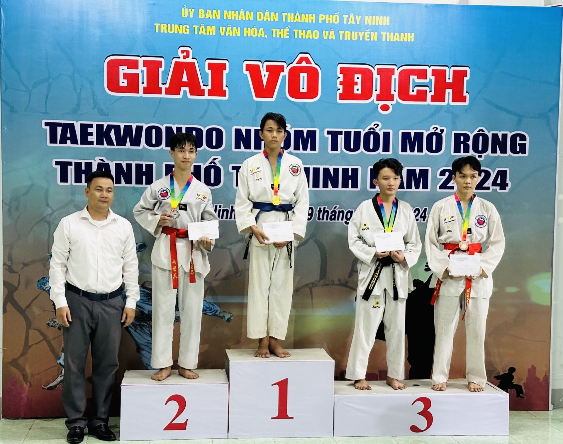 Liên đoàn Taekwondo tỉnh Tây Ninh trao giải cho các vận động viên đạt thành tích xuất sắc trong nhóm tuổi mở rộng.