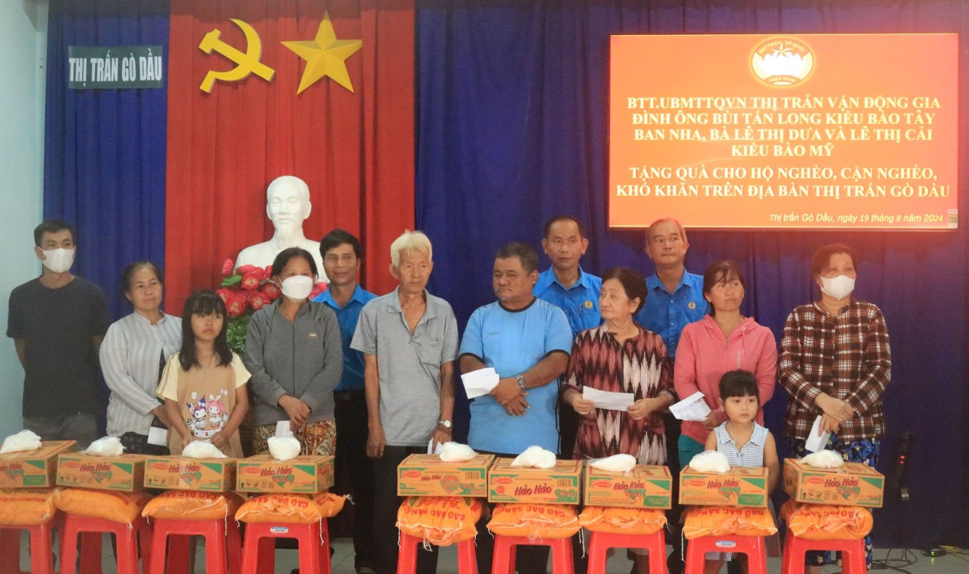 Mỗi phần quà trị giá 400.000 đồng (gồm gạo, mì gói, nhu yếu phẩm khác) và 100.000 đồng tiền mặt, do MTTQ thị trấn Gò Dầu vận động mạnh thường quân tài trợ.