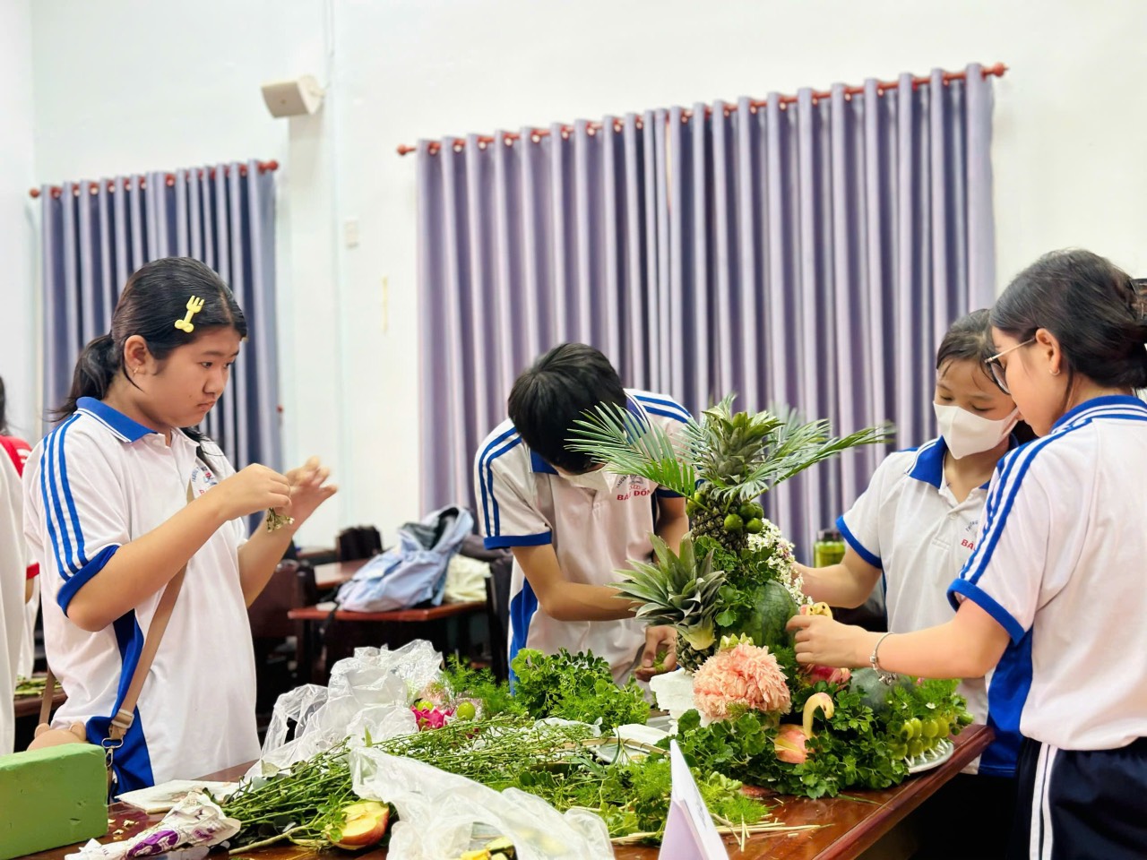 Các em tỉ mỉ tham gia phần thi trang trí mâm ngũ quả.