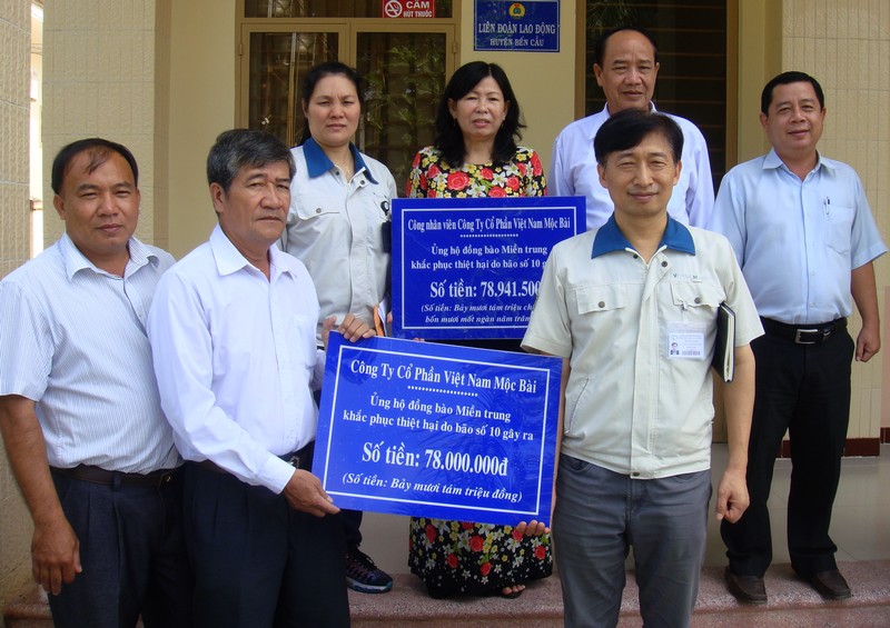 * Công ty cổ phần Việt Nam-Mộc Bài vừa trao số tiền gần 157 triệu đồng cho LĐLĐ huyện Bến Cầu, nhờ chuyển đến hỗ trợ đồng bào miền Trung bị thiên tai. Đây là phần đóng góp của công nhân và Ban Giám đốc công ty, nhằm chia sẻ những khó khăn của người dân bị ảnh hưởng bởi thiên tai, lũ lụt.