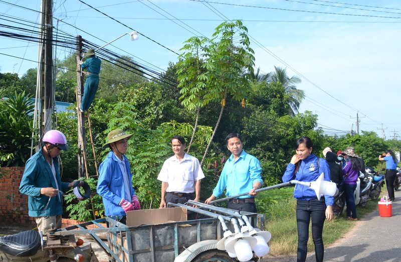 | Cán bộ, hội viên thanh niên thực hiện công trình “Thắp sáng đường quê” ở ấp Thanh Hùng. |